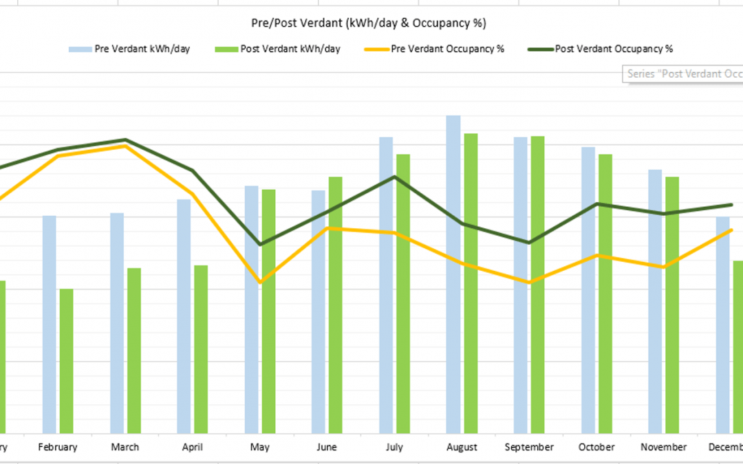 As you can see, the degree days are virtually identical from one year to the next, but the kWh consumption has been reduced by between 10-20% in the months identified post-Verdant EMS installation. We can confidently say that this kilowatt-hour reduction is the result of Verdant’s energy management system.